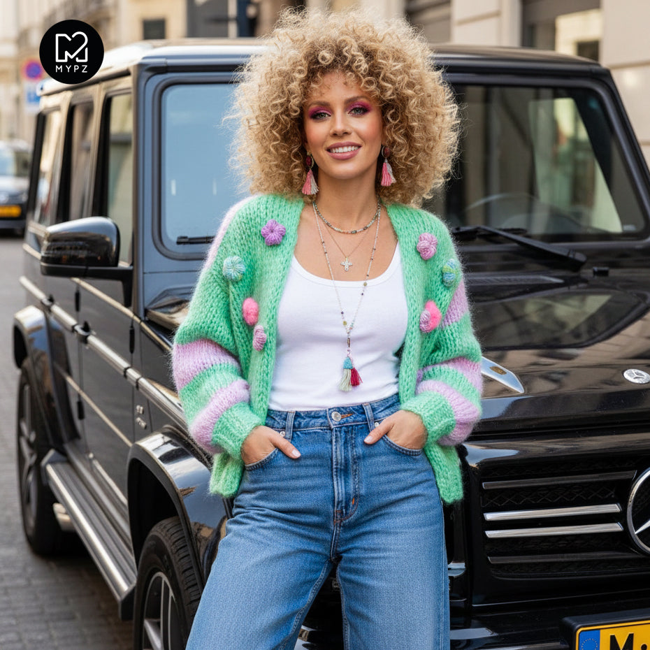 This is a handmade knit made by MYPZ in The Netherlands. Each cardigan or sweater is a unique piece and we take a lot of time and care to create these beautiful products. This beautiful sweater is made of a high quality mohair and does not pill. It is very light, warm and comfortable. These brushed yarns may shed a little but after a while, this will subside.