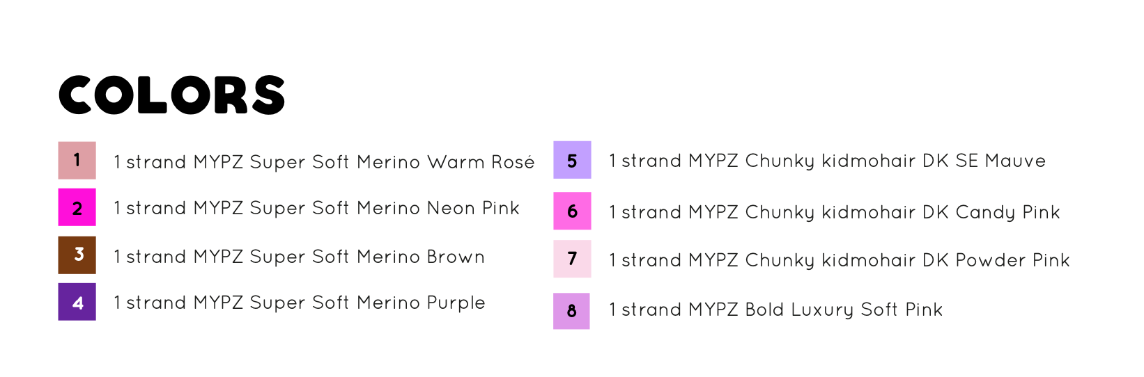 COLOR 7: • ±60 meter MYPZ Chunky kidmohair DK (78% Mohair, 13% Wool, 9% Nylon | 50g - 90m) or any other hairy DK - weight yarn (+5m M/L) (+10m L/XL) (+15m XL/XXL)