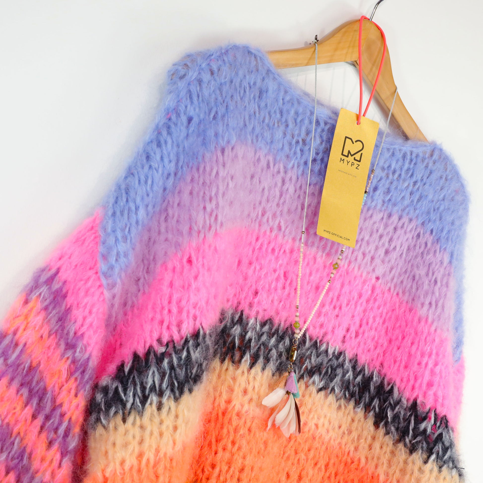 It’s very light, warm and comfortable. This kit contains MYPZ Chunky Kidmohair DK, a high quality fine brushed mohair that does not pill. These brushed yarns may shed a little but after a while this will subside.