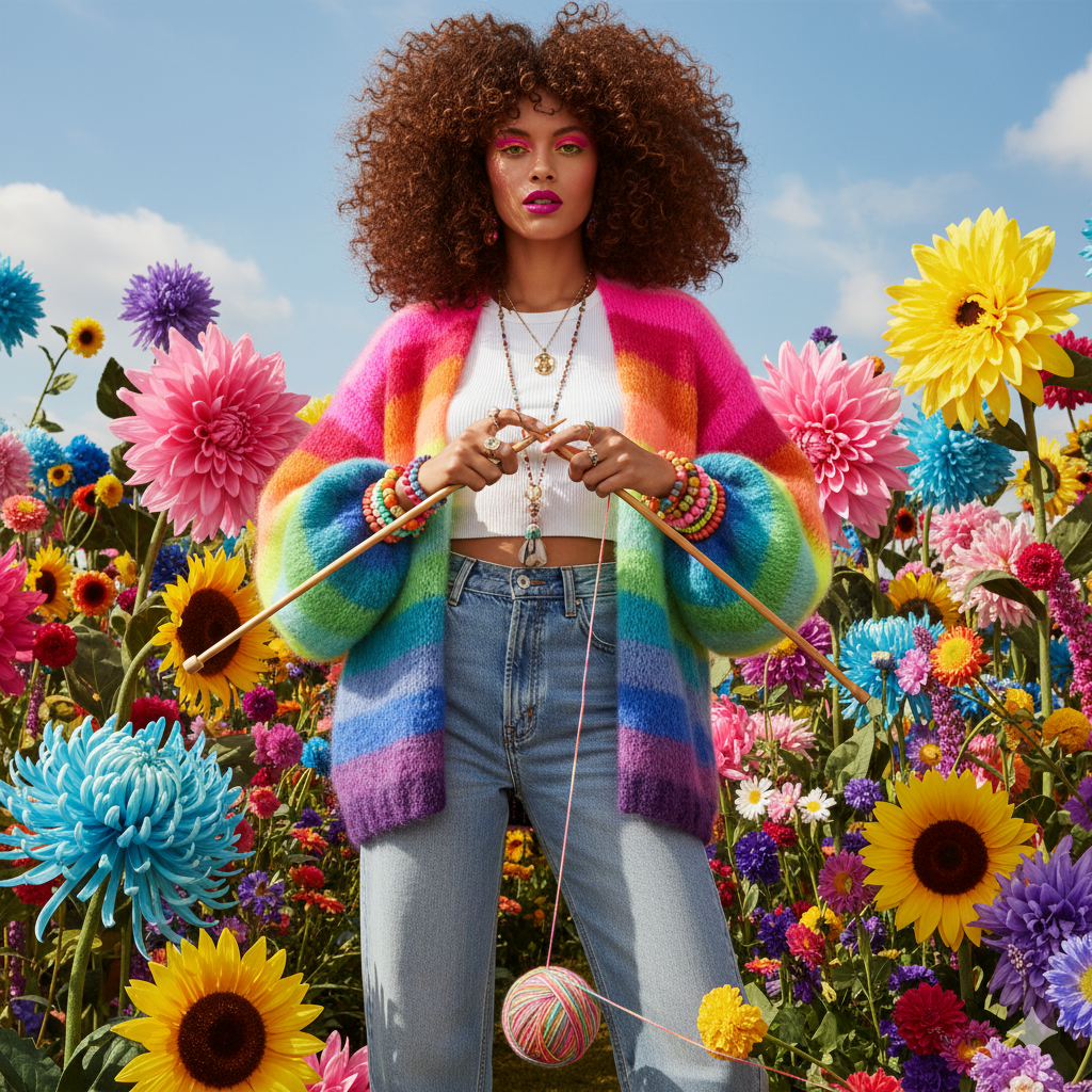 This light mohair cardigan in all the colors of the rainbow is a pleasure to wear because it is warm and very light. The entire pattern is supported with a line drawing which shows the number of stitches. Refer to the line drawing at all steps. This kit contents 13 balls of MYPZ chunky kidmohair DK, that's enough for all sizes.